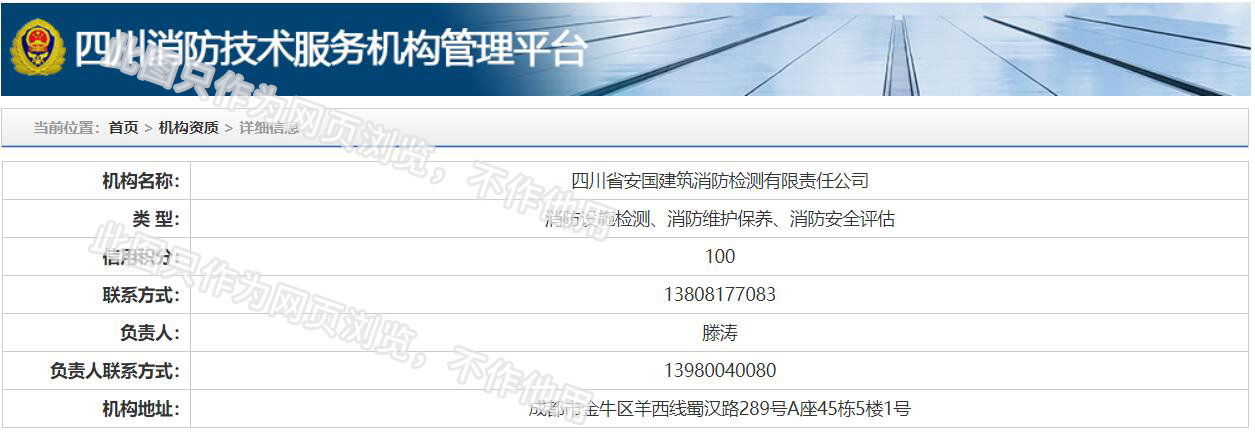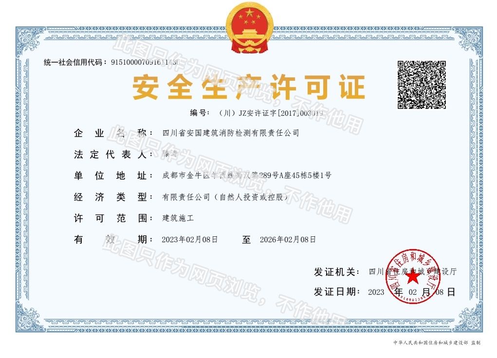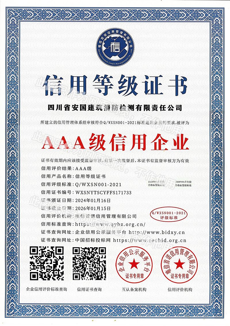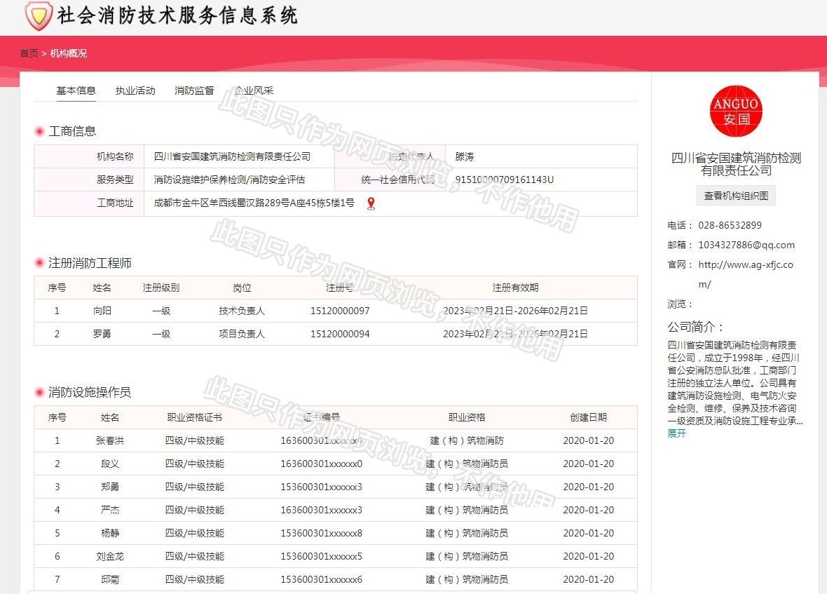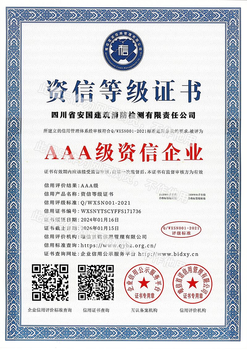 四川省安國(guó)建筑消防檢測(cè)有限責(zé)任公司,成立于1998年,經(jīng)四川省公安消防總隊(duì)批準(zhǔn),工商部門注冊(cè)的獨(dú)立法人單位。 公司具有建筑消防設(shè)施檢測(cè)、電氣防火安全檢測(cè)、維修、保養(yǎng)及技術(shù)咨詢一級(jí)資質(zhì)的中介技術(shù)服務(wù)機(jī)構(gòu),獲得CMA計(jì)量認(rèn)證。主要業(yè)務(wù)范圍是:接受建設(shè)單位或有關(guān)單位委托,承擔(dān)新建、改建、擴(kuò)建建筑自動(dòng)消防設(shè)施技術(shù)檢測(cè)、電氣防火安全檢測(cè)、以及承接建筑消防設(shè)施維護(hù)保養(yǎng),對(duì)已交付使用的建設(shè)消防設(shè)施的運(yùn)行情況進(jìn)行運(yùn)行檢測(cè),開(kāi)展建筑消防設(shè)施的消防安全技術(shù)咨詢。公司設(shè)辦公室、總工辦、財(cái)務(wù)部、檢測(cè)部、維保部等職能機(jī)構(gòu),擁有一